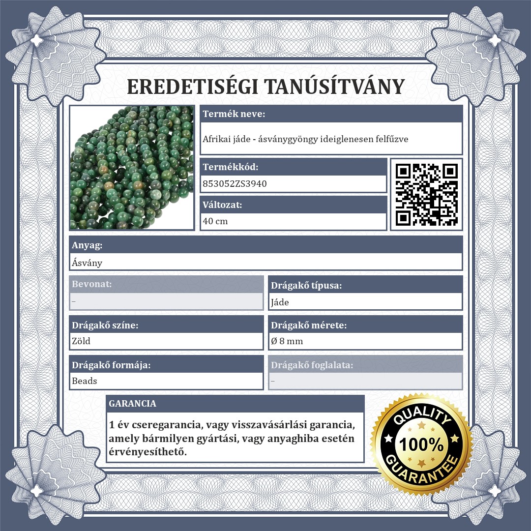 A drágakövek eredetiségét a hivatalos minőségi tanúsítvány bizonyítja.