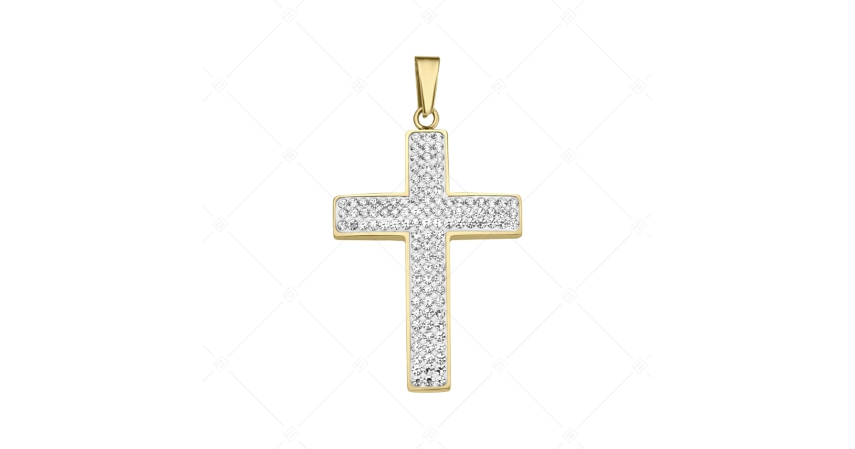 Gyönyörű, csillogó cseh kristályokkal kirakott kereszt alakú medál. 316L orvosi, rozsdamentes nemesacél ékszer, 18K arany bevonattal.