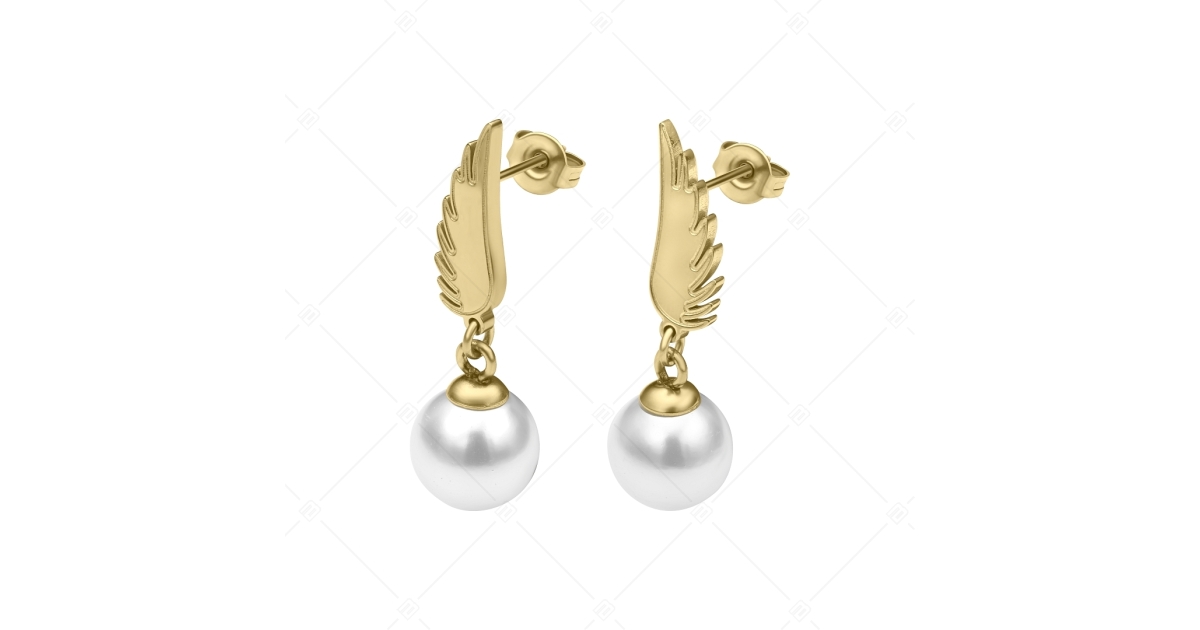 Bájos angyalszárny formájú fülbevaló, amelyet egy fehér kagylógyöngy díszít. 316L orvosi rozsdamentes acél ékszer, 18K arany bevonattal. Kiváló minőségű anyagának köszönhetően nem színeződik, nem kopik el.