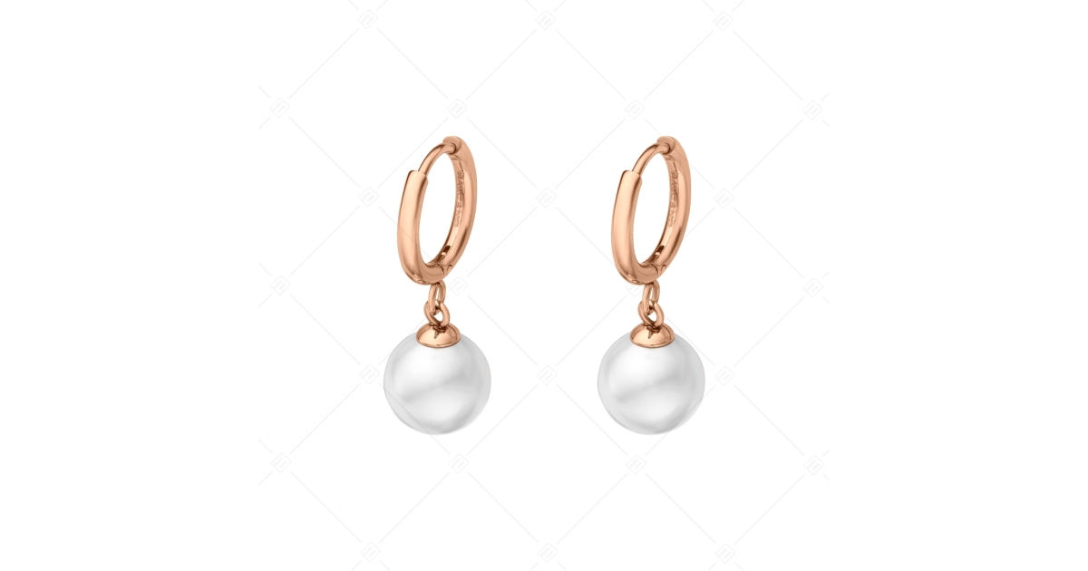 Elegáns, kerek fülbevaló, selyemfényű gyönggyel díszítve. Antiallergén,orvosi 316L rozsdamentes acél ékszer, 18K rozé arany bevonattal.
