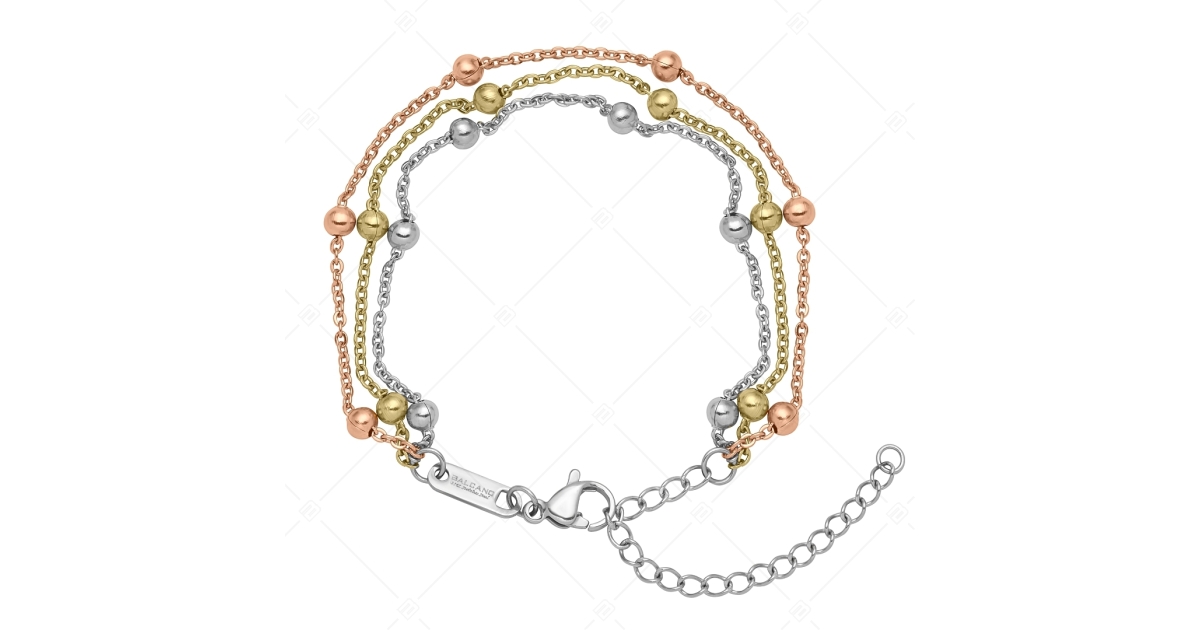 Egyedi, divatos, több soros lapított szemes anker karkötő, bogyós díszítéssel. Kiváló minőségű, antiallergén 316L orvosi rozsdamentes acélból, 18K arany és rozé arany bevonattal, illetve magasfényű polírozással.