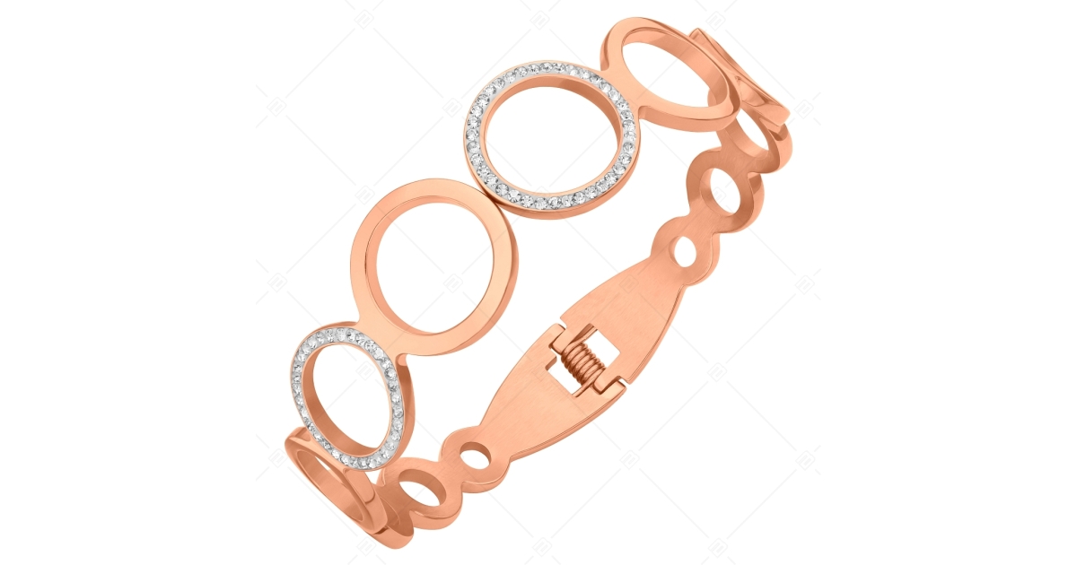 Körökből formált mintájú 316L allergiamentes nemesacél karperec magasfényű polírozással és 18K rozé arany bevonattal. Csillogó cseh kristály berakással díszítve. Anyagának köszönhetően nem kopik és nem színeződik el, sőt a víz sem árt neki. Egyedi és kényelmes ékszer.
