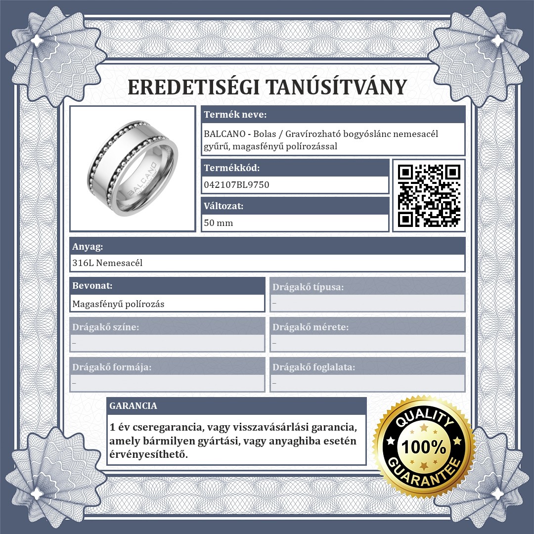 Antiallergén 316L nemesacél gyűrű magasfényű polírozással. Kiváló minőségű acél ékszer, amely kialakításának köszönhetően alkalmas egyedi szövegek, motívumok gravírozására is. A gyűrű két oldalán beágyazott bogyóslánc díszítés fut körbe.