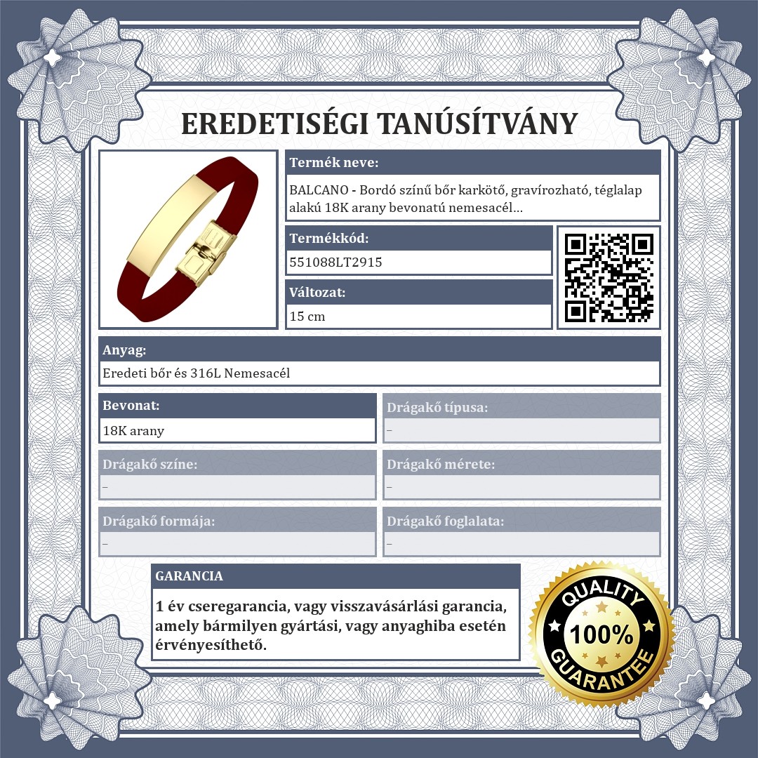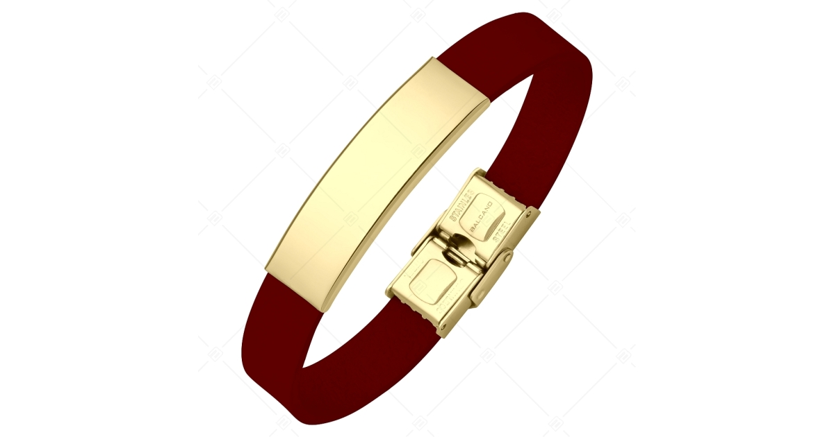 BALCANO - Bordó színű bőr karkötő, gravírozható, téglalap alakú 18K arany bevonatú nemesacél fejrésszel