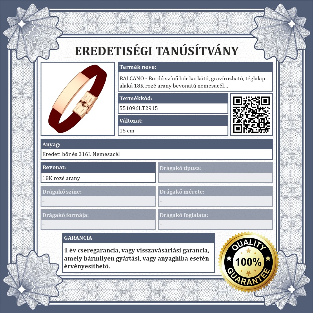| Anyag színe: | Rozé arany (vörös arany) / Bordó |