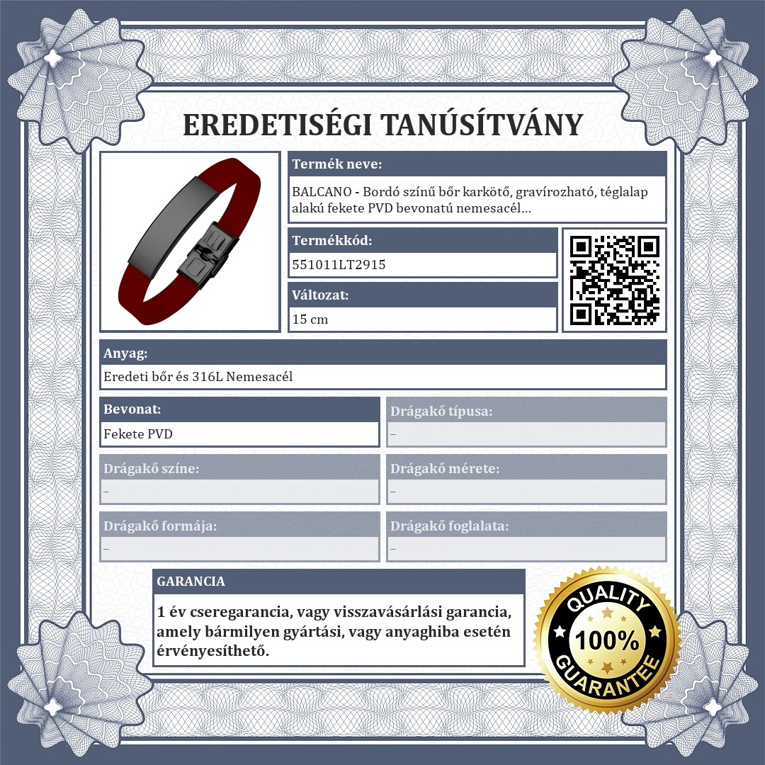 BALCANO - Bordó színű bőr karkötő, gravírozható, téglalap alakú fekete PVD bevonatú nemesacél fejrésszel