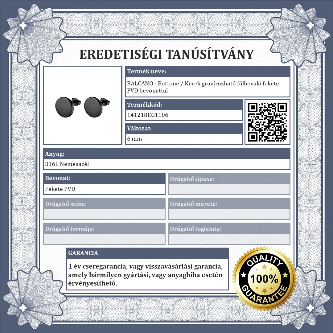 Gravírozható felületű, 316L orvosi rozsdamentes acélból készült, lapított fejű, bedugós fülbevaló, fekete króm PVD bevonattal. Több méretben elérhető.