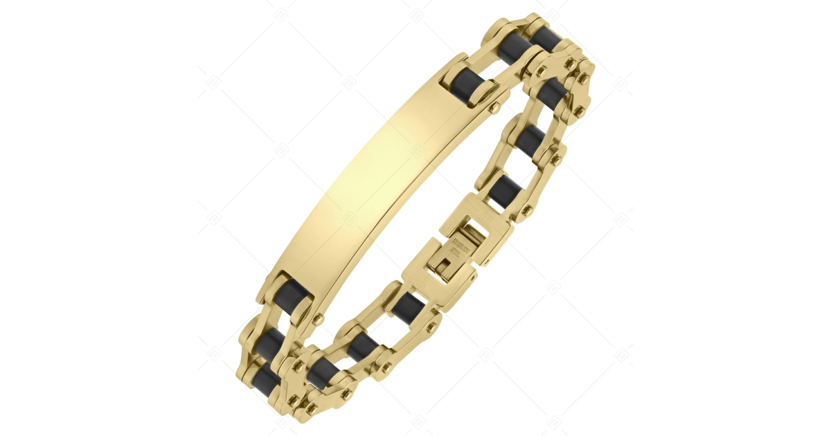 Divatos, motorlánc típusú karkötő. 316L orvosi nemesacélból készült, 18K arany, és fekete PVD bevonattal. Fejrésze téglalap alakú, sima felületű, így alkalmas gravírozásra, amellyel egyedi ajándék is könnyen készíthető belőle.