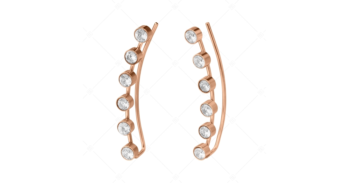 Különleges kialakítású, csillogó, víztiszta cirkónia drágakövekkel kirakott a fül ívére simuló fülbevaló. Orvosi nemesacél ékszer, amely anyagának köszönhetően rendkívül tartós, csodás 18K rozé arany bevonattal.