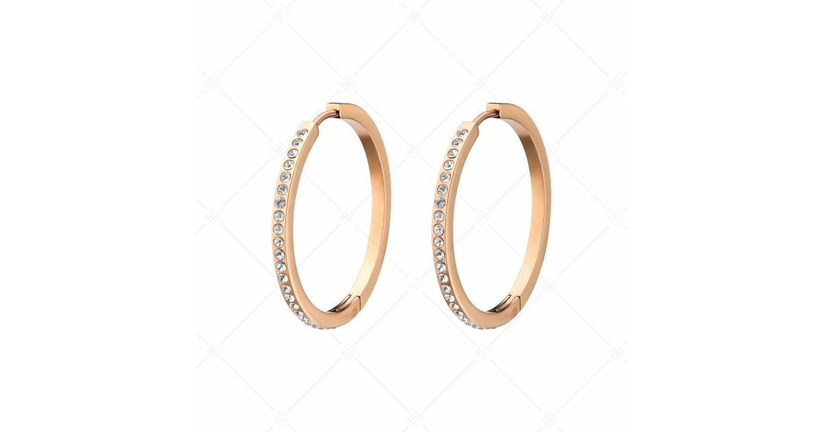Divatos karika fülbevaló, amelyet csillogó cirkónia kristályok díszítenek. 316L orvosi rozsdamentes acél ékszer, 18K rozé arany bevonattal. Magas minőségű anyagának köszönhetően nem színeződik, nem kopik el.