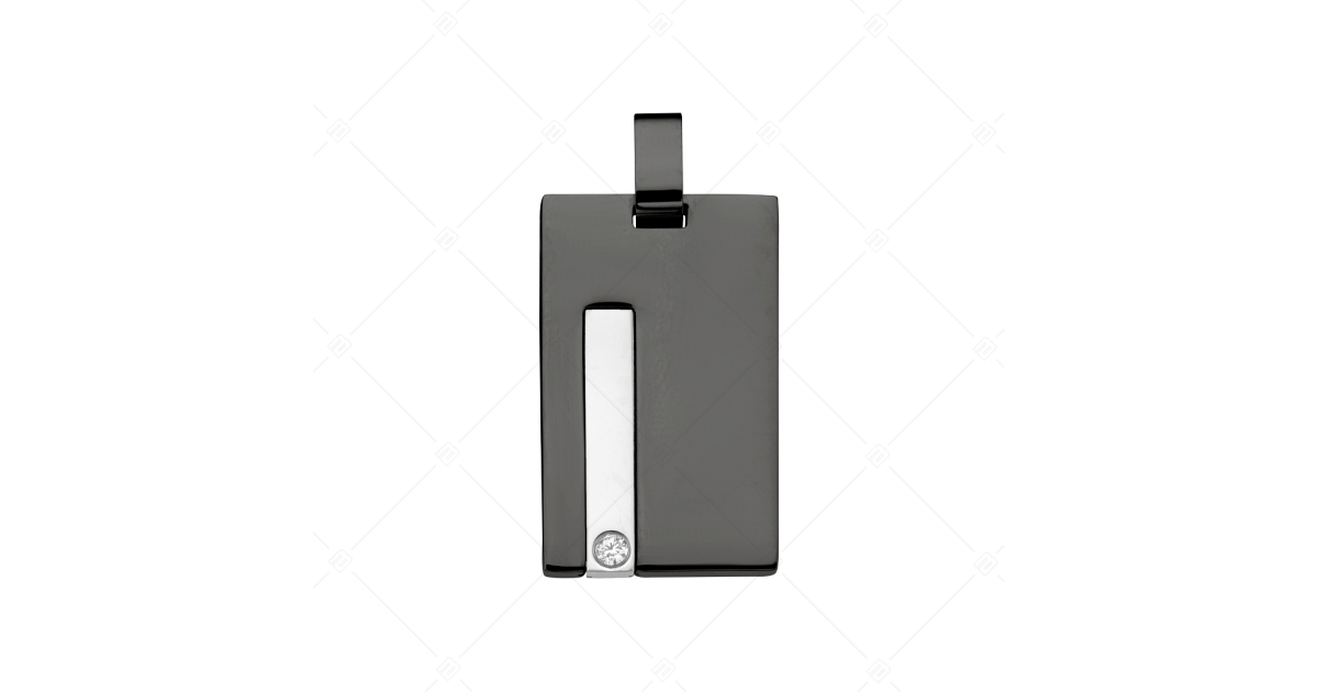 Antiallergén, orvosi 316L nemesacél téglalap alakú medál, fekete PVD bevonattal. Alsó részén egy ezüst színű dekor csík teszi egyedivé, amelyet egy csodás cirkónia drágakő díszít. Felülete akár gravírozásra is alkalmas lehet.