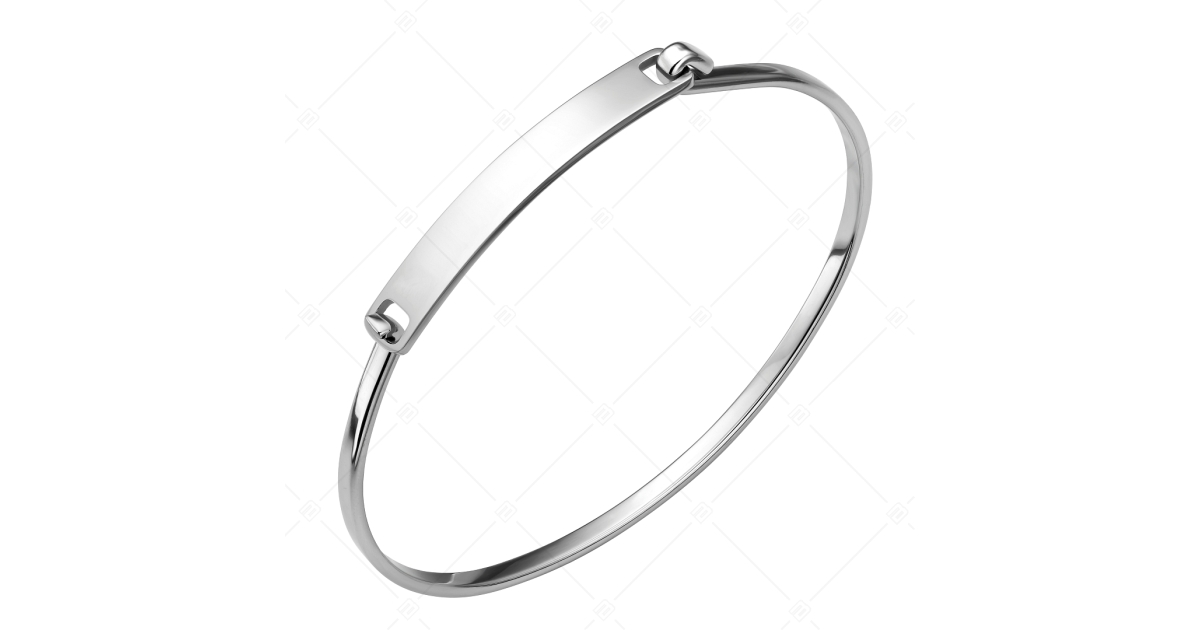 Minimál design nemesacél karperec nyitható, gravírozható fejrésszel. A karperec anyaga 316L allergiamentes orvosi nemesacél magasfényű polírozással.