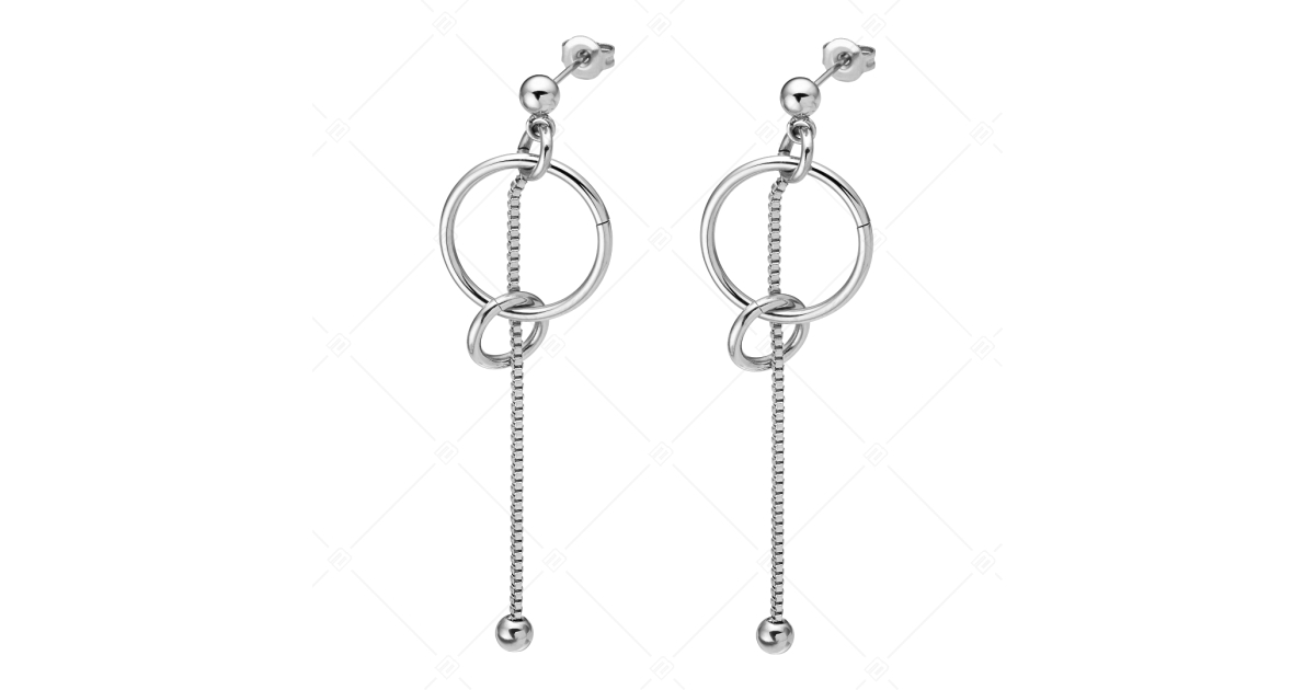 Divatos fülbevaló, antiallergén, rozsdamentes 316L nemesacélból, magasfényű polírozással. Bedugós felső résszel, pillangózárral, amelyet egy hosszú láncon, két, egymásba fonódó karika díszít.