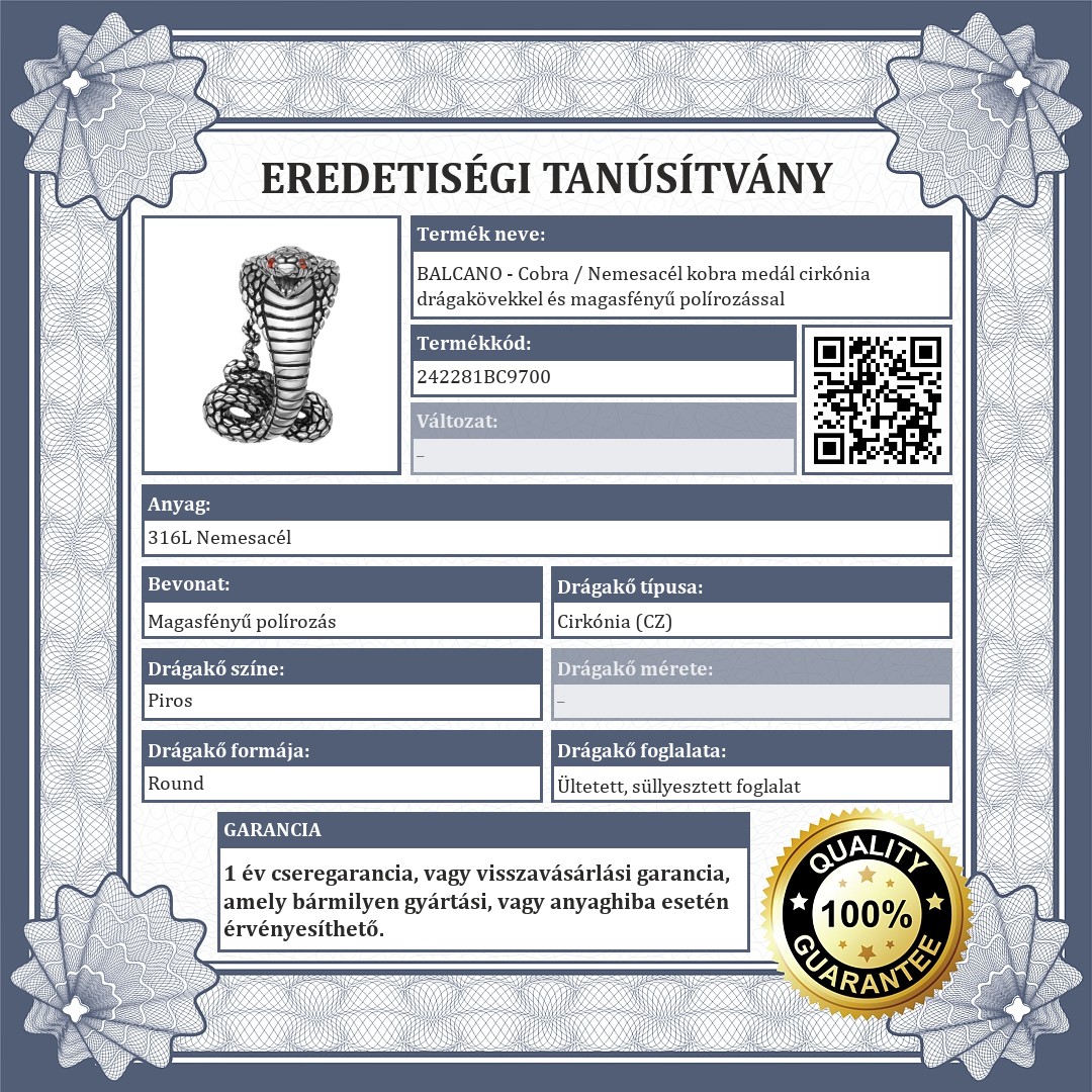 Anyagának köszönhetően allergiamentes, nem kopik és nem szineződik el. A kobra szemei piros cirkónia drágakövekből készültek.