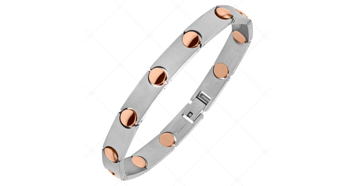 Szálra húzott, azaz matt felületű karkötő, merev, téglalap alakú szemek között körben, 18K rozé arany bevonatos kör alakú díszítéssel. 316L orvosi, rozsdamentes, antiallergén nemesacél ékszer, biztonságos áthajtós kapoccsal.