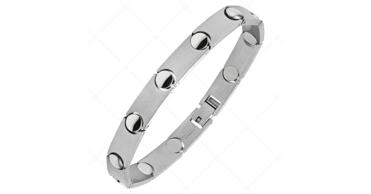 Szálra húzott, azaz matt felületű karkötő, merev, téglalap alakú szemek között körben, fényes, kör alakú díszítéssel. 316L orvosi, rozsdamentes, antiallergén nemesacél ékszer, biztonságos áthajtós kapoccsal.