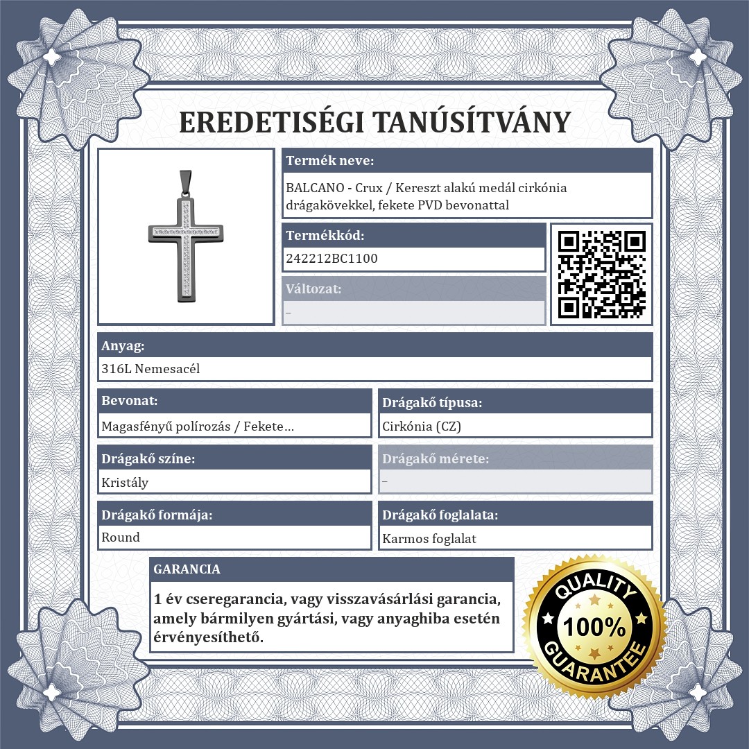 Elegáns és szimbolikus kiegészítő. Az allergiamentes orvosi 316L nemesacél medált két egymáson található kereszt alkotja. Az alsó, szélesebb része fekete, PVD bevonattal. A felső kereszt ezüst színű, magasfényű polírozással készült és végig, csodás, cirkónia kristályokkal van díszítve.