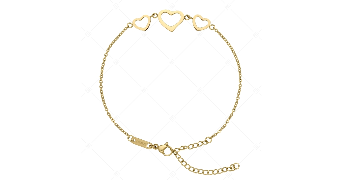 Három darab szívvel ellátott, lapított anker típusú bokalánc. 316L orvosi nemesacél ékszer, 18K arany bevonattal. Divatos és elegáns kiegészítő, amely anyagának köszönhetően antiallergén, nem kopik, nem mattul el használat során.