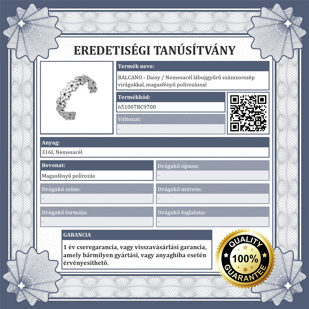 Allergiamentes 316L orvosi, rozsdamentes acél ékszer magasfényű polírozással. Anyagának köszönhetően jól bírja a vizet és kopásálló. A lábujjgyűrű százszorszép virágokat ábrázol.