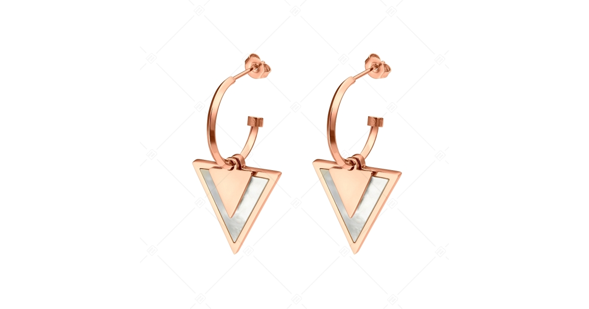 Trendi, 316L orvosi nemesacél fülbevaló, 18K rozé arany bevonattal. Félkör alakú fülbevaló, pillangózárral, amit két, egy kisebb sima felületű, és egy nagyobb gyöngyház bevonattal ellátott háromszög forma díszít.