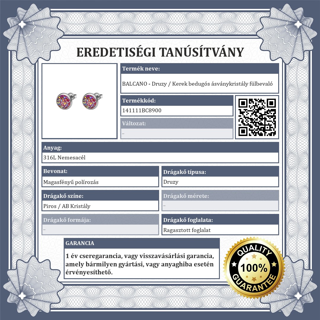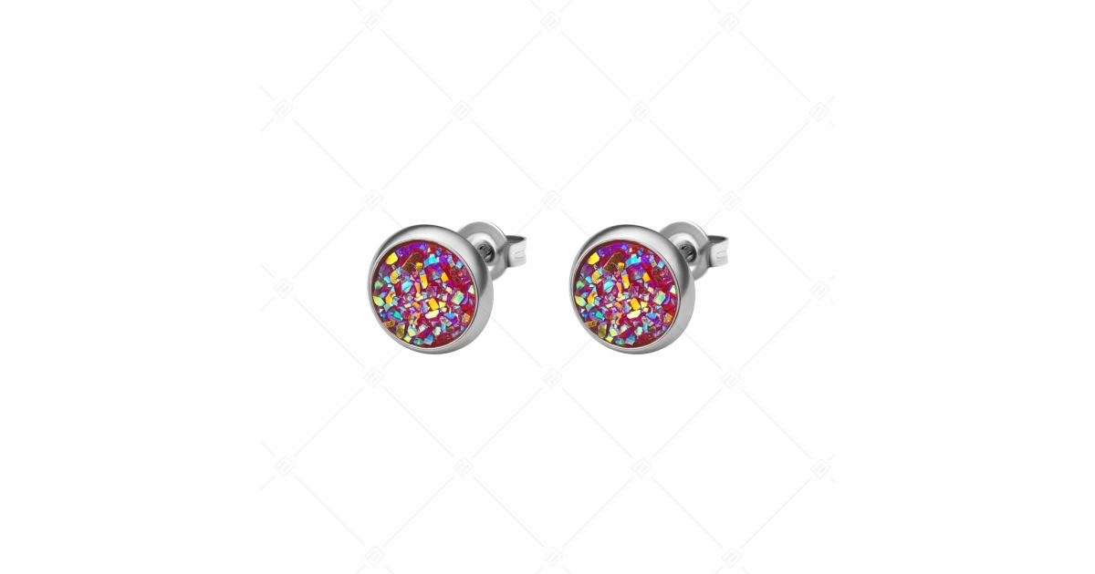 Antiallergén, 316L orvosi nemesacél, bedugós kerek fülbevaló, magas fényű polírozással, pillangózárral. Különlegesen csillogó druzy kristályokkal kirakott fejrésze teszi igazán egyedivé. A druzy kristály a természetben megjelenő ásványok természetes formája.