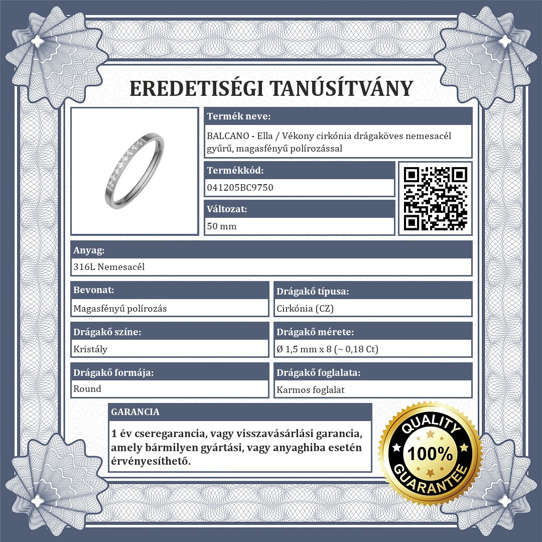 Kifinomult, elegáns vékony gyűrű. Ezüst színű, magasfényű polírozással készült. Fejrészét csillogó, víztiszta cirkónia kristályok díszítik, amelyek biztonságos karmos foglalatban vannak. 316L orvosi, antiallergén nemesacél ékszer.