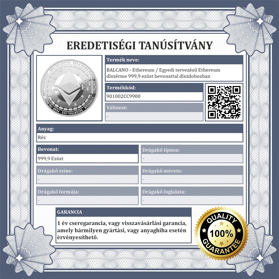 Ethereum díszérme, amely egyedi terv alapján tiszta vörösrézből készül és 999,9 ezüsttel van bevonva. A díszérme átmérője 40 mm és 3,5 mm a vastagsága és állátszó plexi tokban, egy ezüst színű Ethereum logóval ellátott kék bársony díszdobozban van elhelyezve.