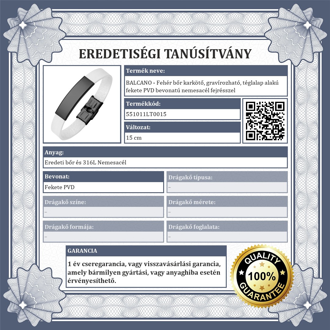 Fehér színű, valódi marhabőr karkötő, amit egy téglalap alakú, fekete PVD bevonatú 316L nemesacél fejrész díszít. Felülete sima, így egyedi ékszer készíthető belőle gravírozással.