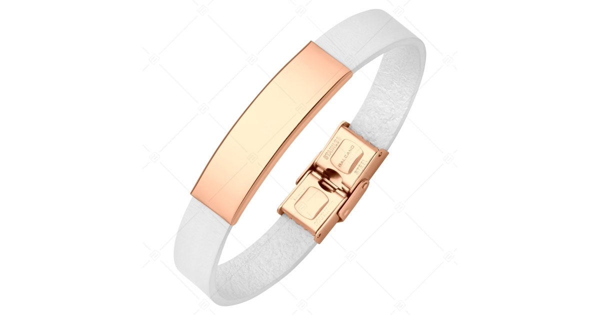 BALCANO - Fehér színű bőr karkötő, gravírozható, téglalap alakú 18K rozé arany bevonatú nemesacél fejrésszel