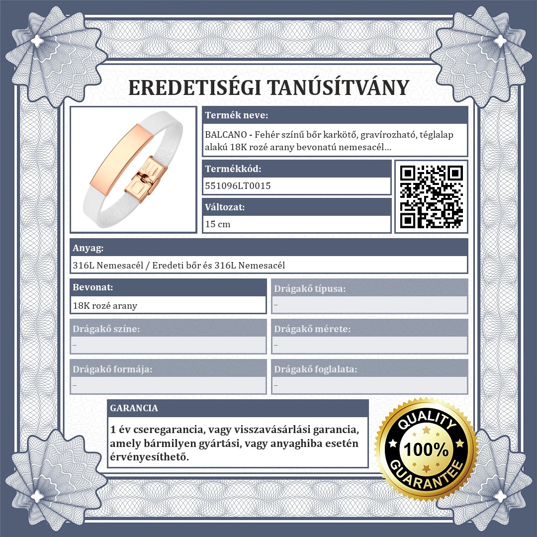 Fehér színű, valódi marhabőr karkötő, amit egy téglalap alakú, 18K rozé arany bevonatú 316L nemesacél fejrész díszít. Felülete sima, így egyedi ékszer készíthető belőle gravírozással.
