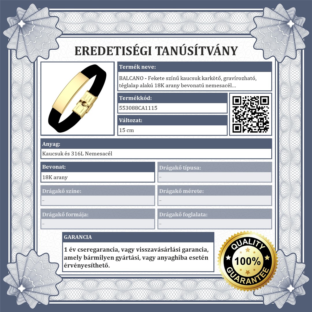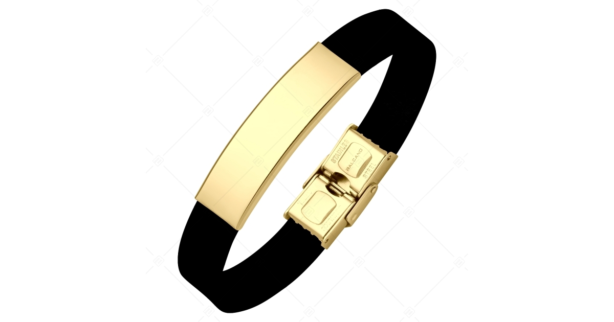 BALCANO - Fekete színű kaucsuk karkötő, gravírozható, téglalap alakú 18K arany bevonatú nemesacél fejrésszel