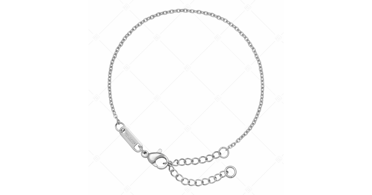 Egyszerű, kifinomult antiallergén, orvosi 316L nemesacél lapított szemes anker karlánc. Kiváló minőségű anyagának köszönhetően nem mattul, nem kopik meg a használata során. Ezüst színű, magasfényű polírozással készült. Állítható méretű, delfin kapoccsal.