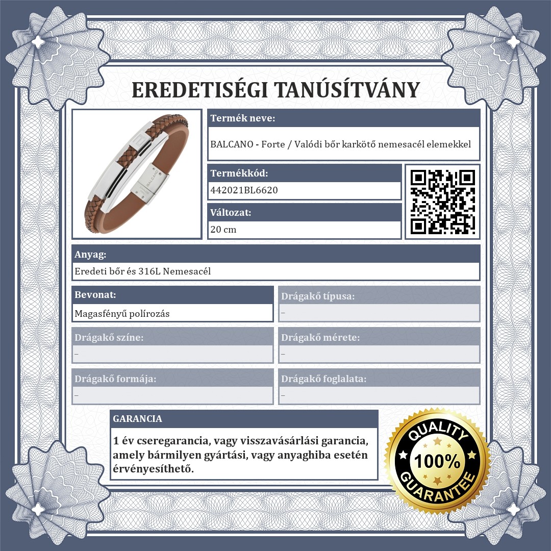 Barna színű, valódi marhabőr karkötő, magasfényű polírozással ellátott nemesacél elemekkel díszítve. Különleges kialakítású, a sima bőr szíjat körbe egy fonott bőrszíj díszíti. A nemesacél díszítőelemek és a mágneses kapocs, antiallergén, 316L orvosi rozsdamenetes acélból készültek, melyek rendkívül tartósak.