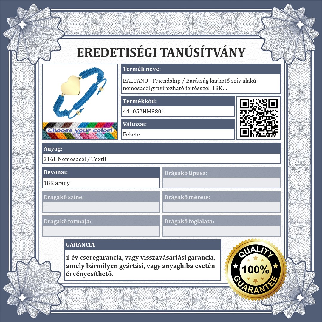 Kézzel készült, állítható méretű karkötő. Anyaga rendkívül erős, mindennapi viseletre alkalmas. A fonott, poliészter anyagú karkötőt egy szív alakú, sima, 316L nemesacél gravírozható felületű fejrész díszít, 18K arany bevonattal.