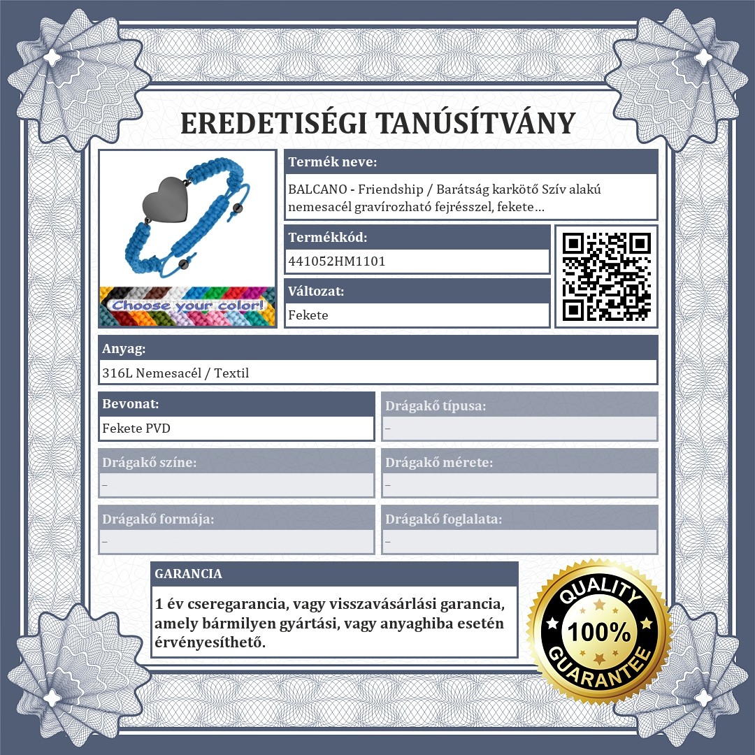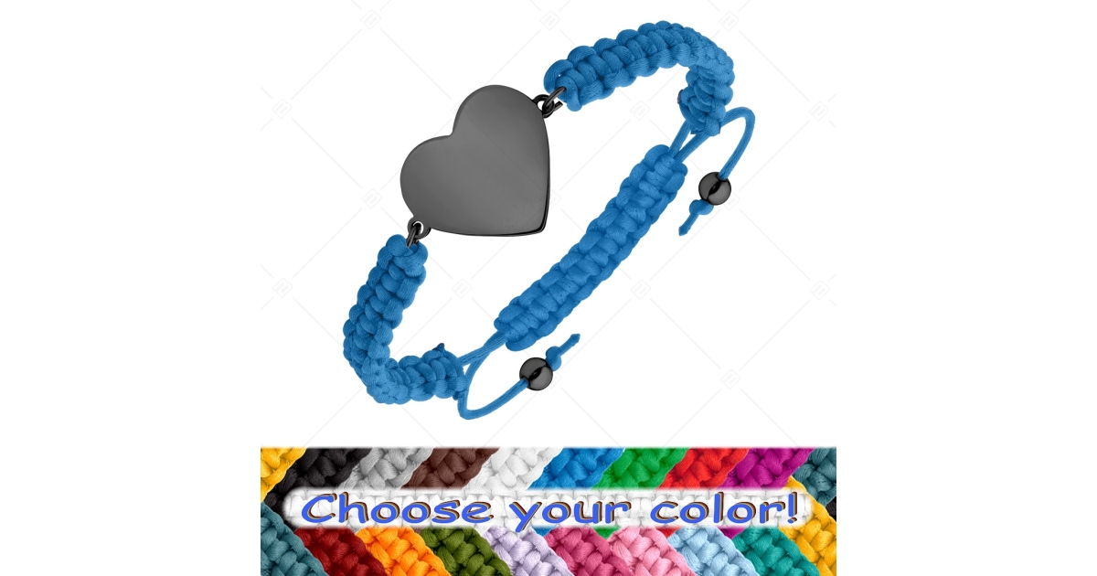 Kézzel készült, állítható méretű karkötő. Anyaga rendkívül erős, mindennapi viseletre alkalmas. A fonott, poliészter anyagú karkötőt egy szív alakú, sima, gravírozható felületű 316L nemesacél fejrész díszít, fekete PVD bevonattal.