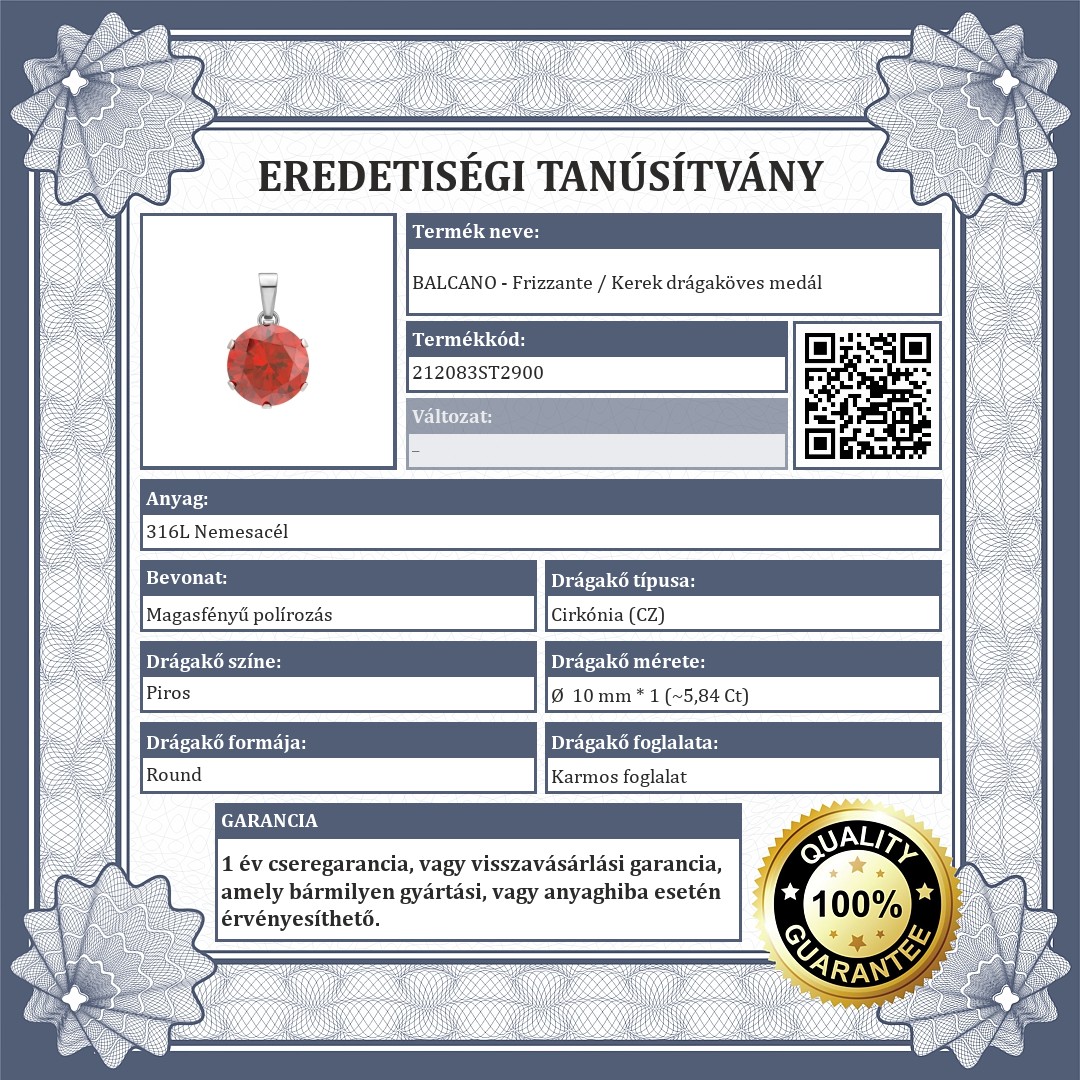 Gránátvörös színű,kerek cirkónia ékköves medál. 316L orvosi rozsdamentes acél ékszer, amely anyagának köszönhetően nem kopik, nem színeződik el.