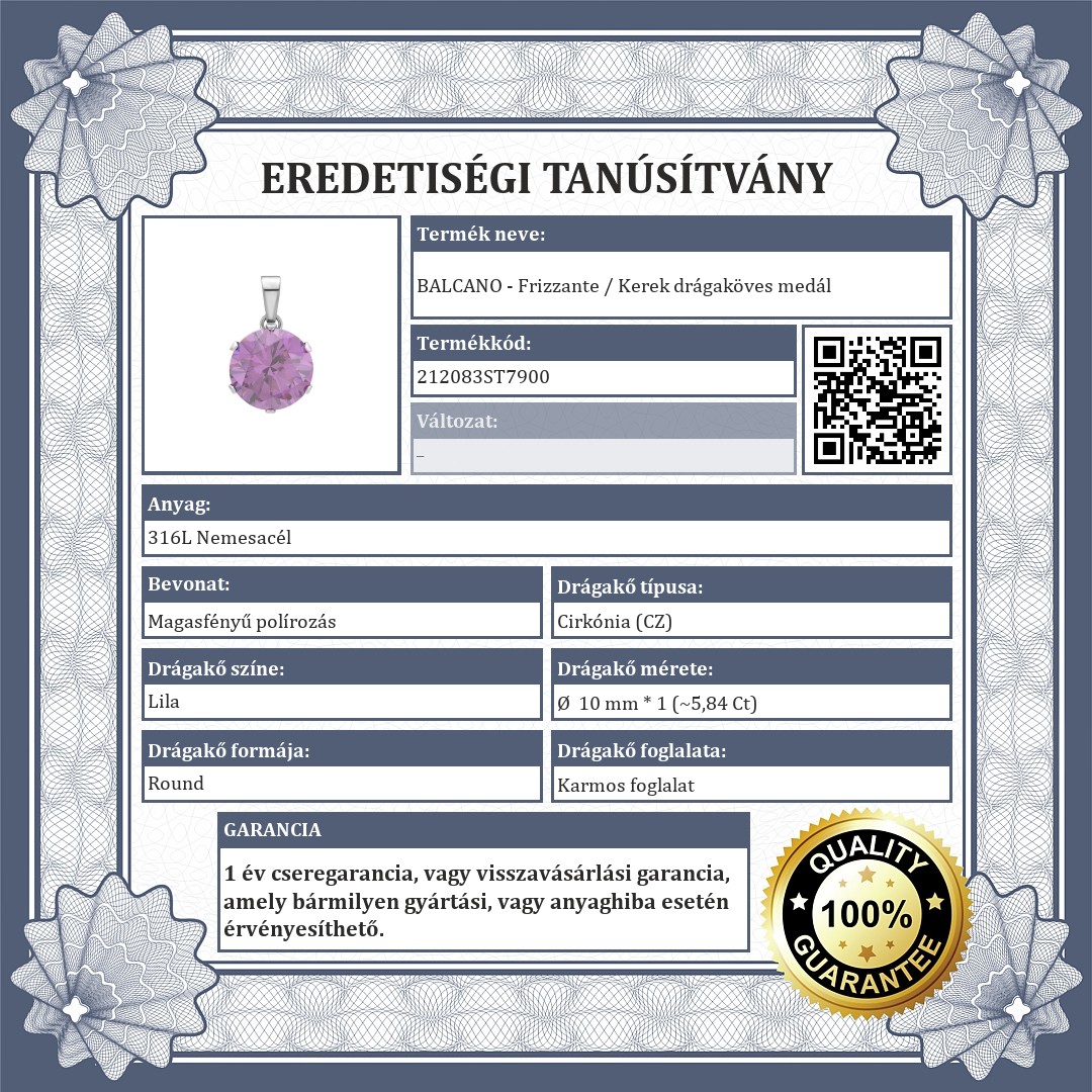 Ametiszt lila színű,kerek cirkónia ékköves medál. 316L orvosi rozsdamentes acél ékszer, amely anyagának köszönhetően nem kopik, nem színeződik el.