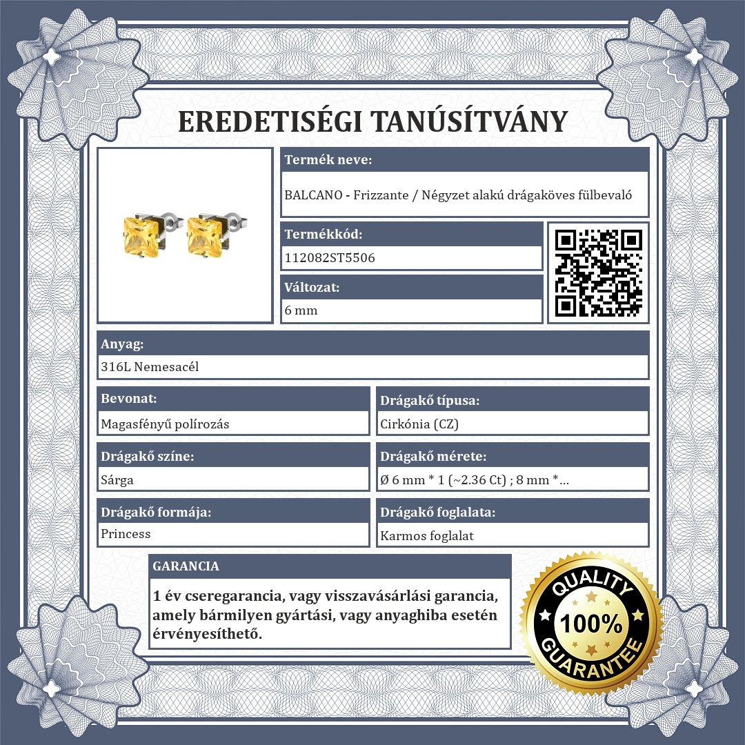 Aranysárga színű,négyzet alakú cirkónia ékkővel díszített bedugós fülbevaló 6 mm és 8 mm-es méretekben. 316L orvosi rozsdamentes acél ékszer, amely anyagának köszönhetően nem kopik, nem színeződik el.