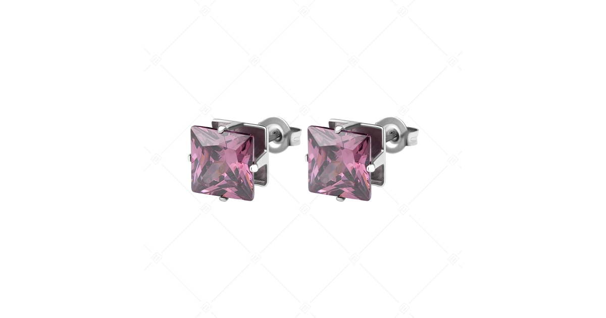 Ametiszt lila színű,négyzet alakú cirkónia ékkővel díszített bedugós fülbevaló 6 mm és 8 mm-es méretekben. 316L orvosi rozsdamentes acél ékszer, amely anyagának köszönhetően nem kopik, nem színeződik el.