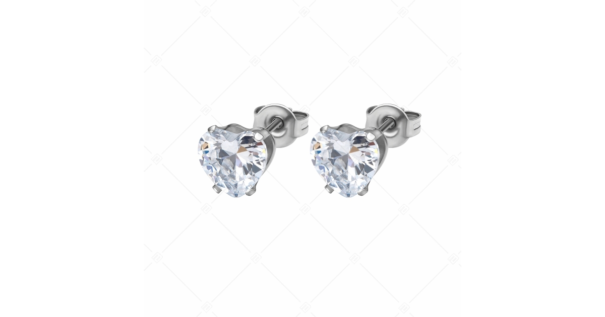 Víztiszta, szív alakú cirkónia ékkővel díszített bedugós fülbevaló 8 mm-es méretben. 316L orvosi rozsdamentes acél ékszer, amely anyagának köszönhetően nem kopik, nem színeződik el.