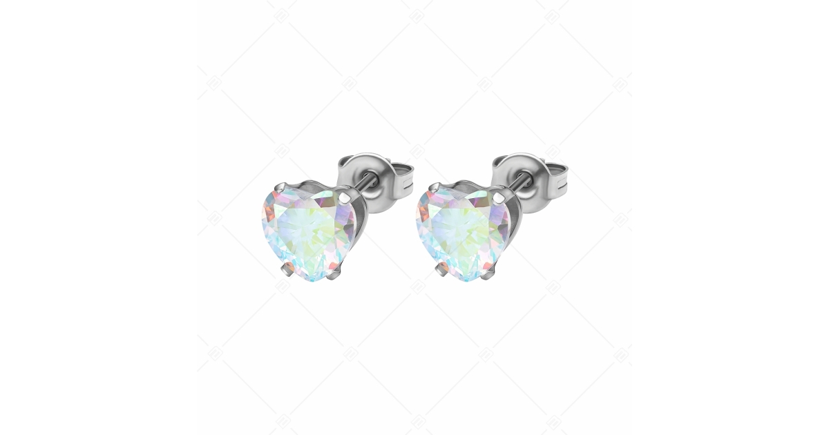 Színjátszó, szív alakú cirkónia ékkővel díszített bedugós fülbevaló 8 mm-es méretben. 316L orvosi rozsdamentes acél ékszer, amely anyagának köszönhetően nem kopik, nem színeződik el.