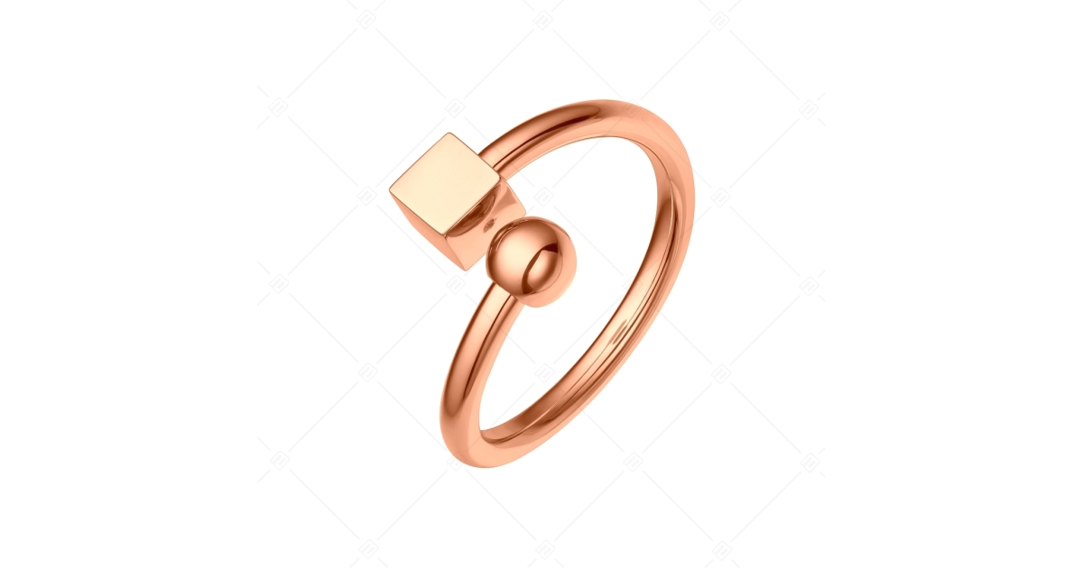 316L orvosi, rozsdamentes acél gyűrű magasfényű polírozással és 18K rozé arany bevonattal. Fejrészét egy kocka és egy golyó dísszel díszíti, ami a játékos szellemet szimbolizálja.