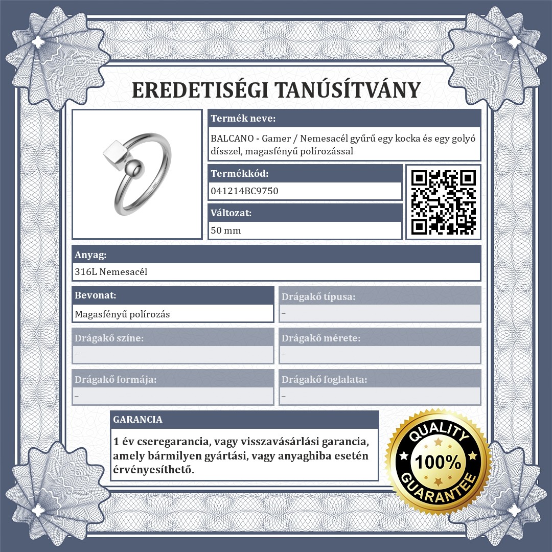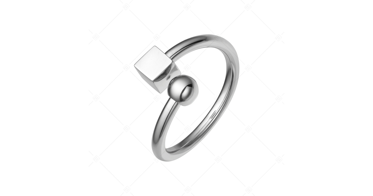 316L orvosi, rozsdamentes acél gyűrű magasfényű polírozással. Fejrészét egy kocka és egy golyó dísszel díszíti, ami a játékos szellemet szimbolizálja.
