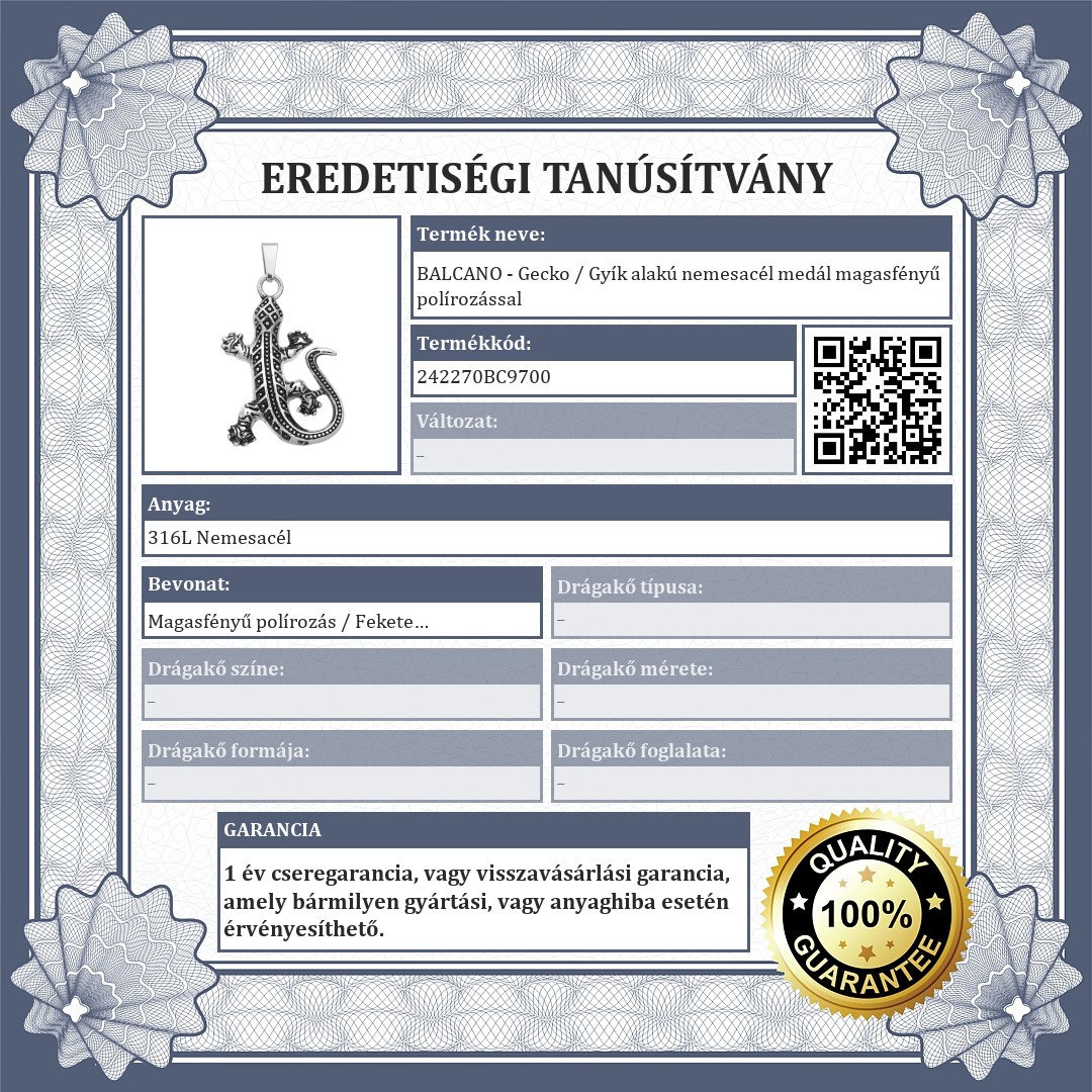 Gyík medál 316L orvosi rozsdamenetes nemesacélból magasfényű polírozással.