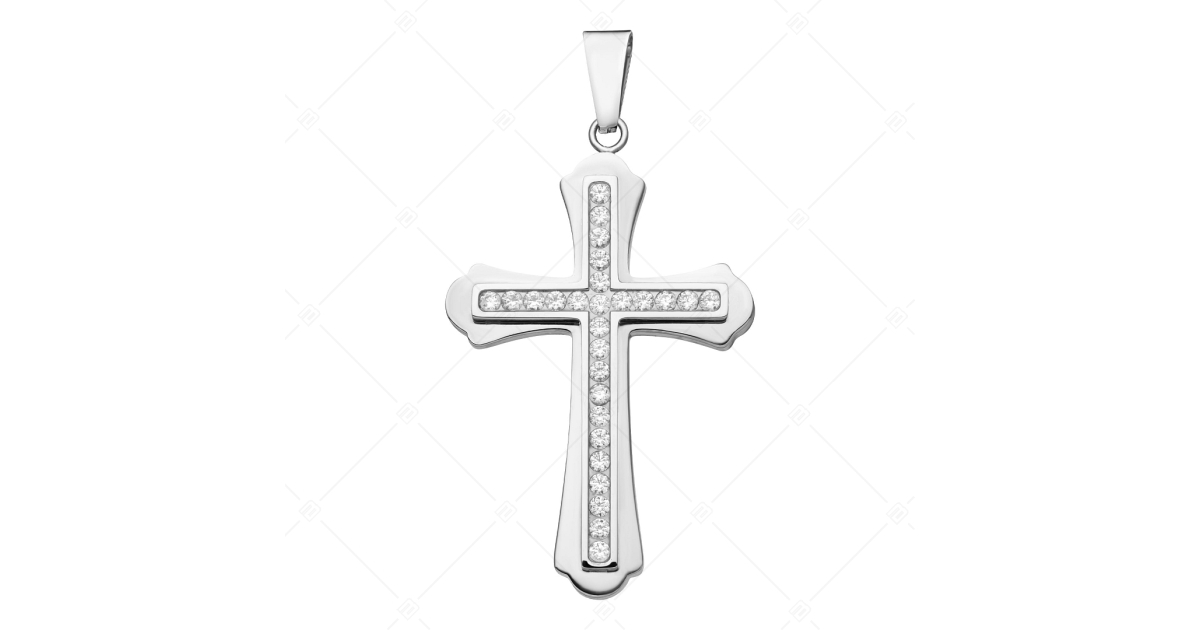 Elegáns és szimbolikus allergiamentes 316L nemesacél kiegészítő. A medált két egymáson található kereszt alkotja, ezüst színű, magasfényű polírozással készült. A keresztet egyedi formája alapján "budded", azaz bimbós keresztnek nevezik. A felső kereszt végig, csodás, cirkónia kristályokkal van díszítve.