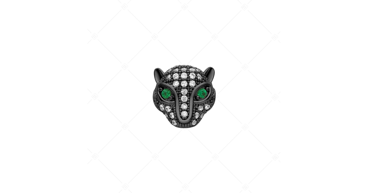 Gepárdfej alakú, rézből készült spacer charm. Divatos kiegészítő zöld és víztiszta cirkónia kövekkel kirakva, fekete króm PVD bevonattal.