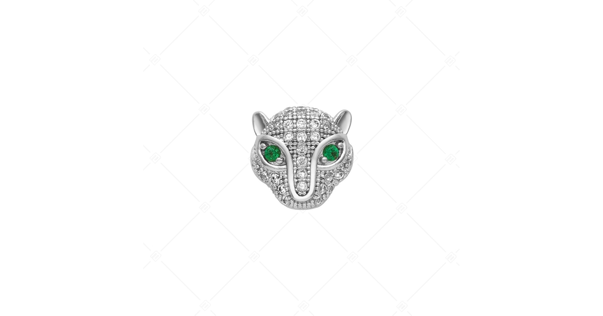 Gepárdfej alakú, rézből készült spacer charm. Divatos kiegészítő zöld és víztiszta cirkónia kövekkel kirakva, ezüst színű, 925 Sterling ezüst bevonattal készült.