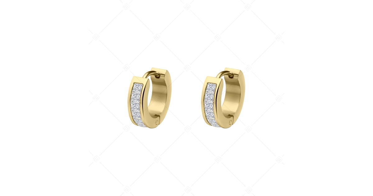 Elegáns, bepattintós fülbevaló, elülső részén csillogó, víztiszta négyzet alakú cirkónia ékkövekkel kirakva. 18K arany bevonattal készült antiallergén 316L nemesacél ékszer. Kiváló minőségű anyagának köszönhetően nem kopik, nem színeződik el.