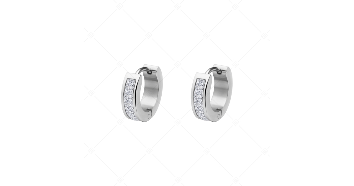 Elegáns, bepattintós fülbevaló, belső részén csillogó, víztiszta négyzet alakú cirkónia ékkövekkel kirakva. Ezüst színű, magasfényű polírozással készült antiallergén 316L nemesacél ékszer. Kiváló minőségű anyagának köszönhetően nem kopik, nem színeződik el.