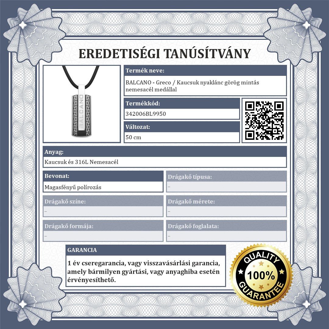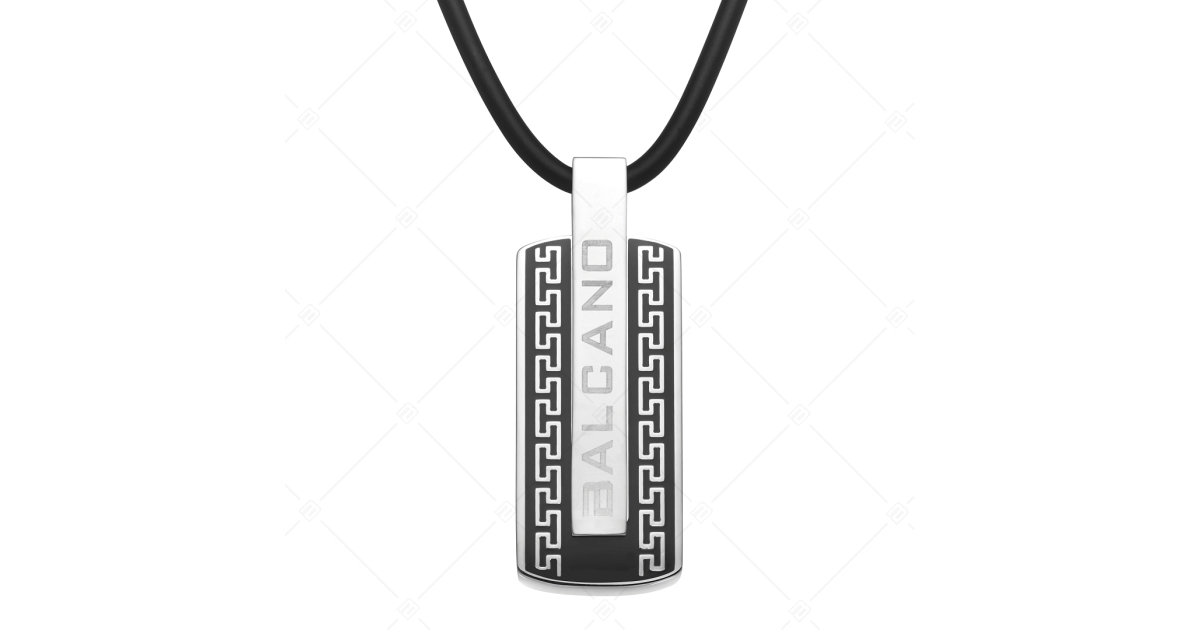 Egyedi, ezüst- fekete színű, görög mintás medál, amelyet a középen futó BALCANO gravírozott felirat tesz még különlegesebbé.